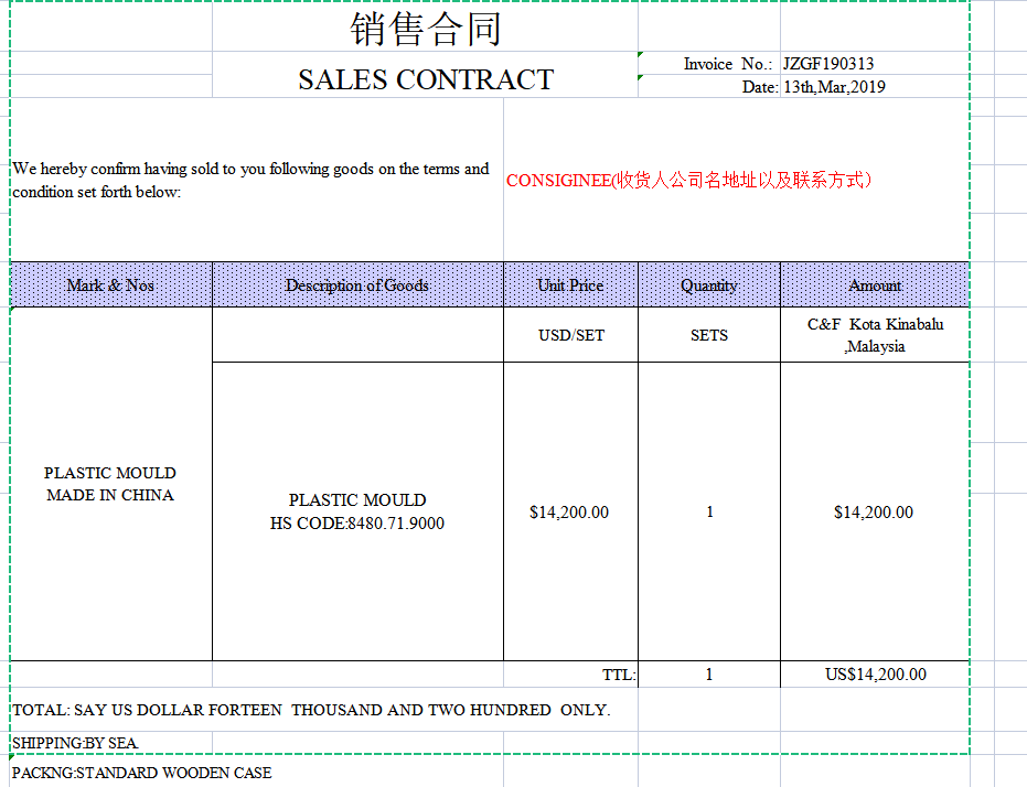 | SALES CONTRACT | Invoice No.: | JZGF190313 | ||