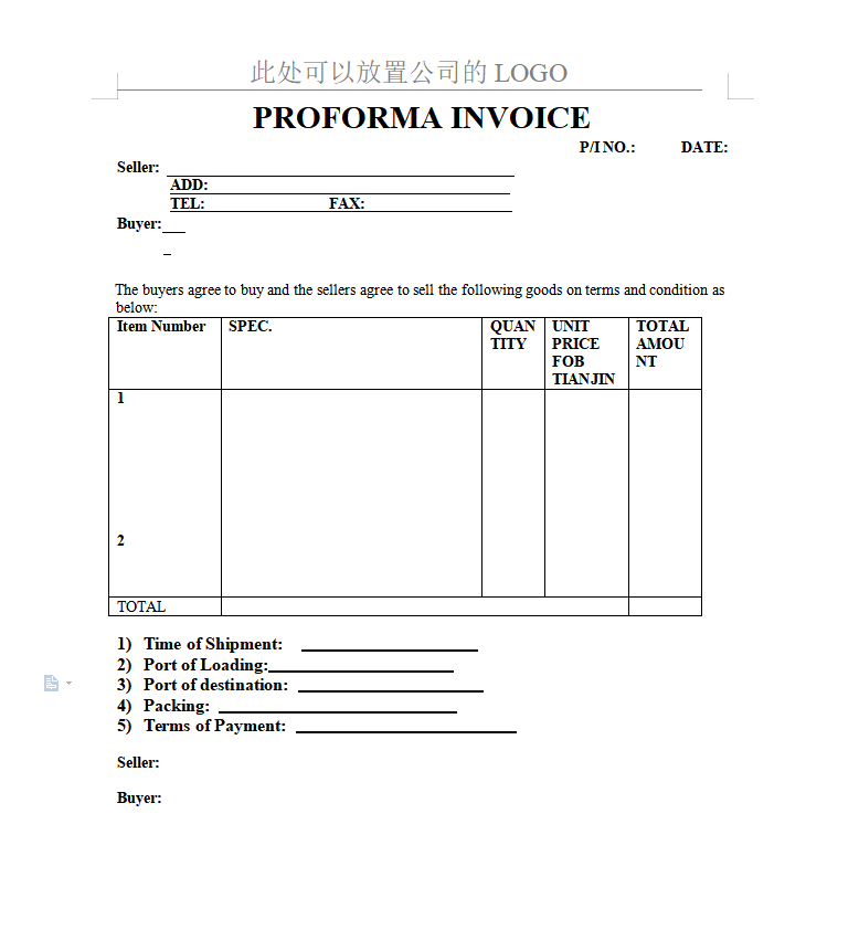| Item Number | SPEC. | QUANTITY | UNIT PRICE FOB TIANJIN |